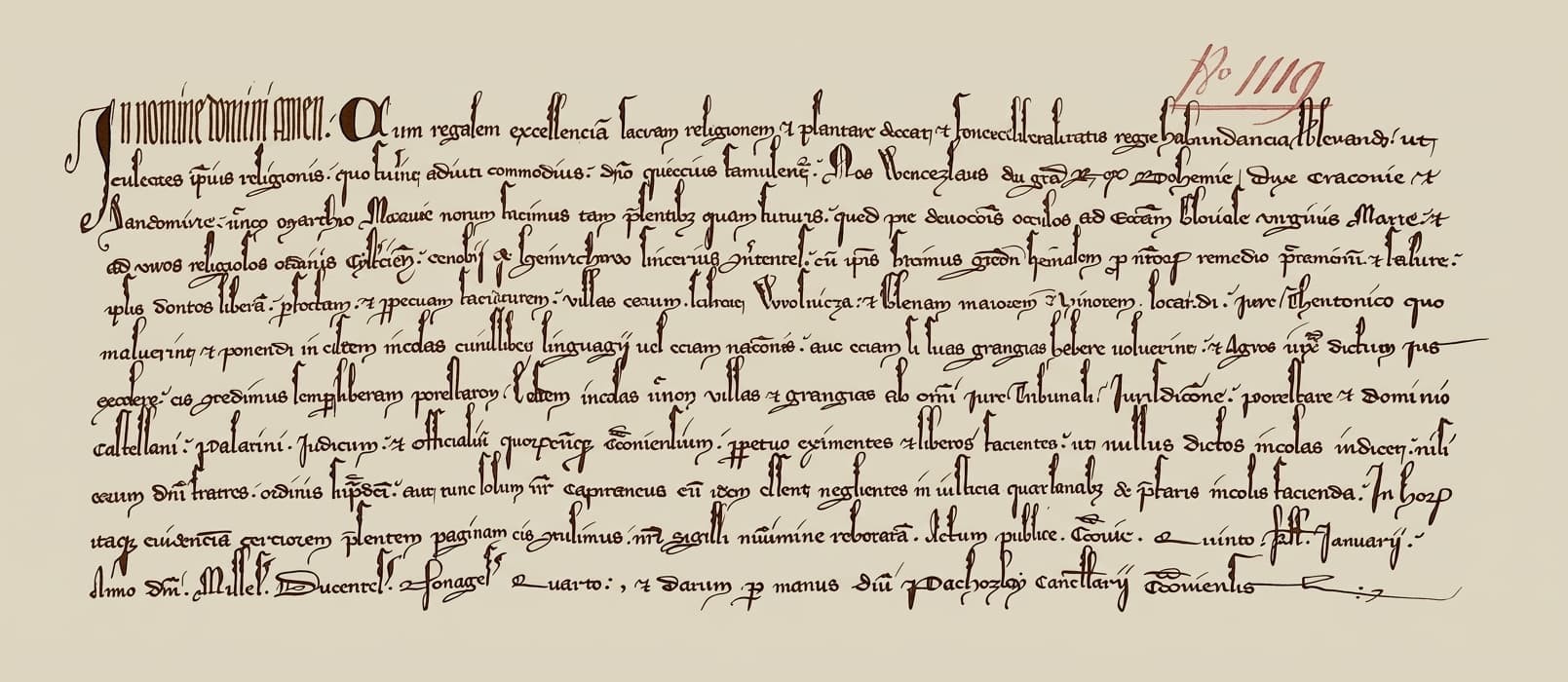 We, Wenceslaus, by the grace of God King of Bohemia, Duke of Kraków and Sandomierz, and Margrave of Moravia, make known to both present and future that, turning our devout regard toward the Church of the glorious Virgin Mary and toward the monks of the Cistercian Order in Henryków, serving God there, we show them special grace for the salvation of the souls of our ancestors and of our own, granting them full and free authority to establish their villages, namely Wolnica and Greater and Lesser Glewa, under German law, in whatever manner they choose, and to settle in them people of any language or nation, or, if they prefer, to establish manorial farms there.