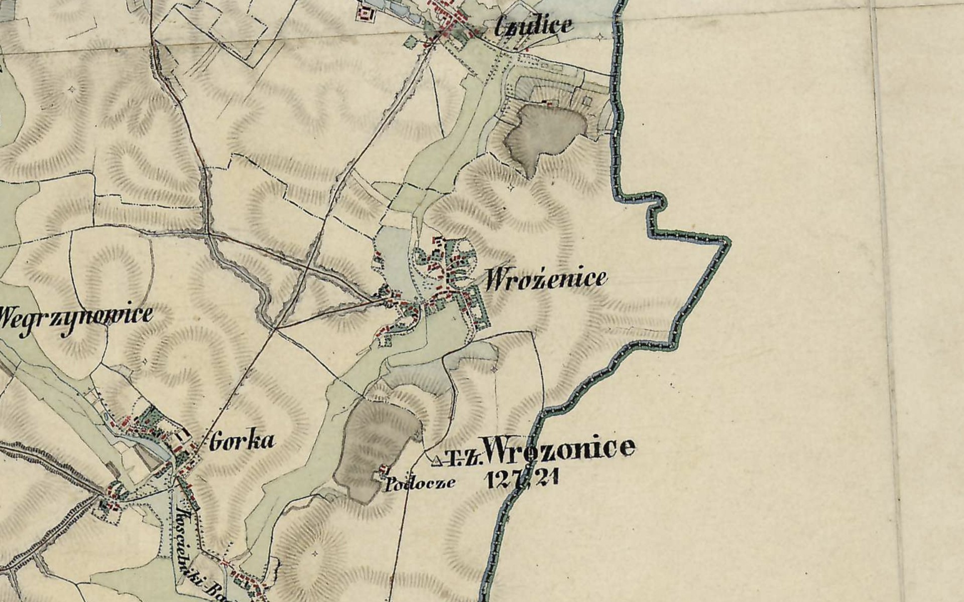 Interestingly, these maps already include the designation “T.Z. Wrozonice 127.21” (Triangulations-Zone). This refers to a triangulation point—a geodetic marker that, in a somewhat modernized form, still serves as a reference for surveyors and cartographers today.