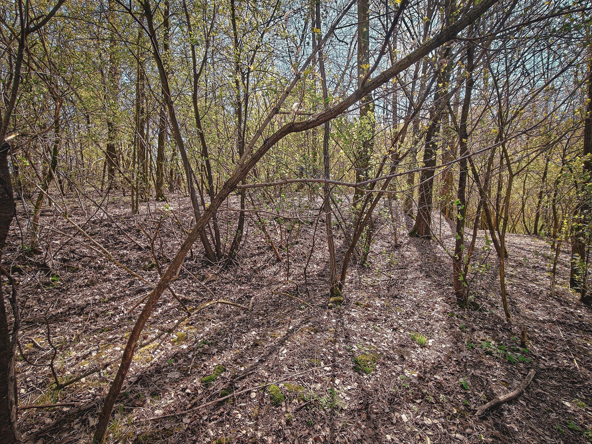After a short walk and pushing through a rather distinctive, poorly preserved forest filled with fallen trees, we reach the destination of our excursion. A thin layer of humus, while effectively covering the faint remains of former inhabitants, suggests two possibilities: either the current tree cover bears little relation to the forest complex shown on 18th-century maps (as their later versions might indicate), or the soil conditions here are exceptionally unfavourable for vegetation.