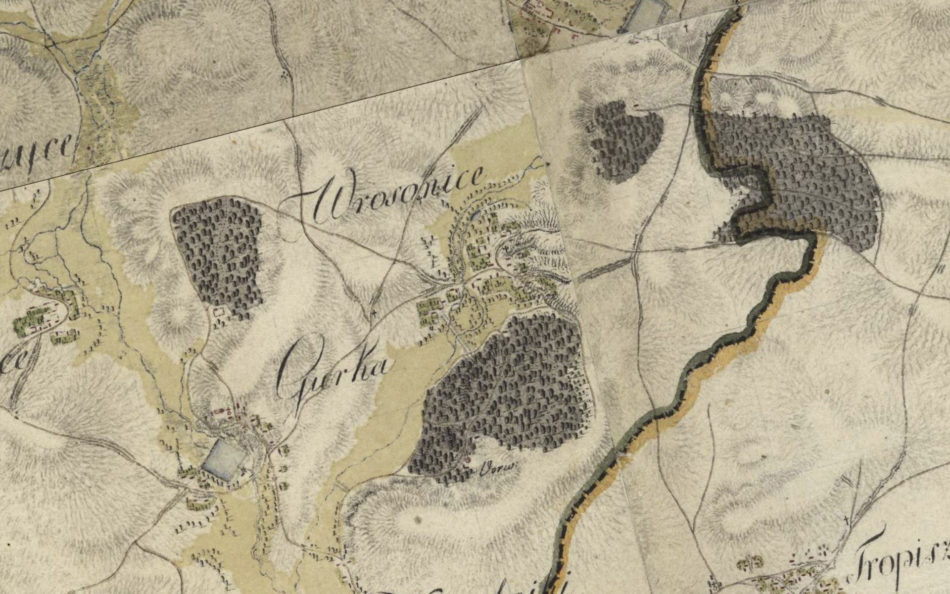 It must, however, be noted with regret that the area of Wróżenice was not included in the earliest mapping of Galicia—Galizien und Lodomerien (1779–1783). At that time, cartographic work ended at the boundary defined by the Vistula River, meaning that only Kraków itself appeared on the sheets in the immediate region. This does not change the fact that praise for the Austro-Hungarian cartographic service is fully justified. A simple comparison of their maps with those produced under the eastern partition clearly demonstrates the superiority of Viennese mapping: in measurement accuracy, terrain representation, and attention to topographic detail—despite the cartographers often bearing Hungarian surnames 😉