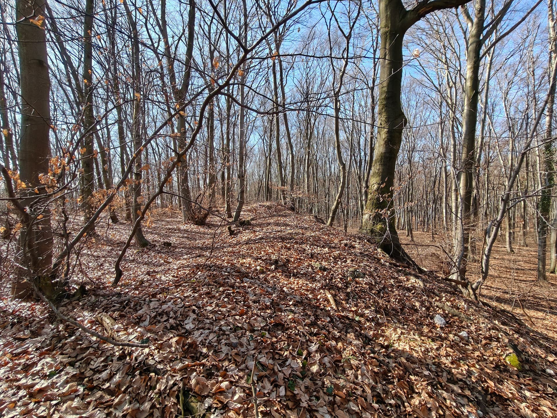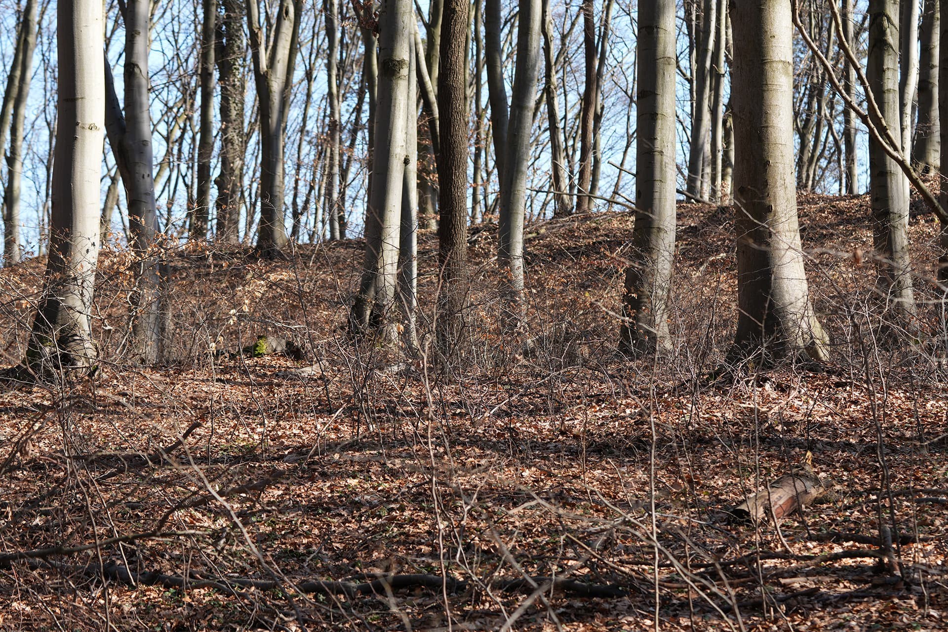Zooming in on the terrain model revealed distinct elevations on the hill near the memorial cross and quarry. Their morphology is difficult to attribute to natural processes or typical agricultural activity.